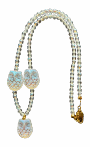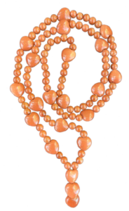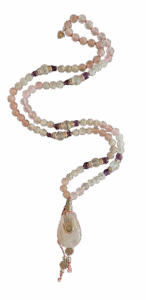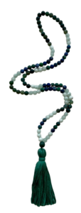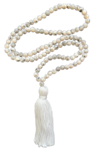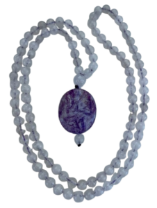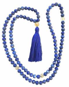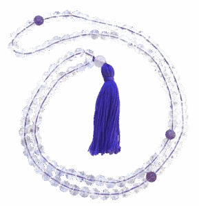 Throughout the world, a sacred strand of 108 beads, called a rosary or a mala, is used for daily meditation and prayer. ‘Mala’ is a Sanskrit word for “meditation garland”. Malas were created in India 3000 years ago and are used by yogis and spiritual seekers to help keep their minds focused while meditating. Mantras and chants are typically repeated hundreds or even thousands of times and the mala is used so one can focus on the meaning or sound of the mantra rather than counting its repetitions. One repetition is usually said for each bead while turning the thumb clockwise around each bead.