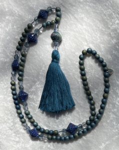 Angelite, Azurite, Jasper, Czech Glass Accents, “Fountain Fern” Mirage Guru, Teal Tassel